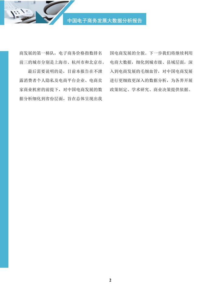 最后需要说明的是,目前本报告在不泄露消费者个人隐私及电商平台企业、电商卖家商业机密的前提下,对中国电商发展的数据分析细化到省份层面,旨在总体呈现出我国电商发展的全貌。下一步我们将继续利用电商大数据,细化到城市级、县域层面,深入到电商发展的毛细血管,对中国电商发展进行更细致更深入的数据分析,为各界开展政策制定、学术研究、商业决策提供依据。