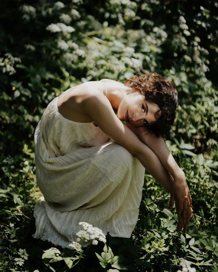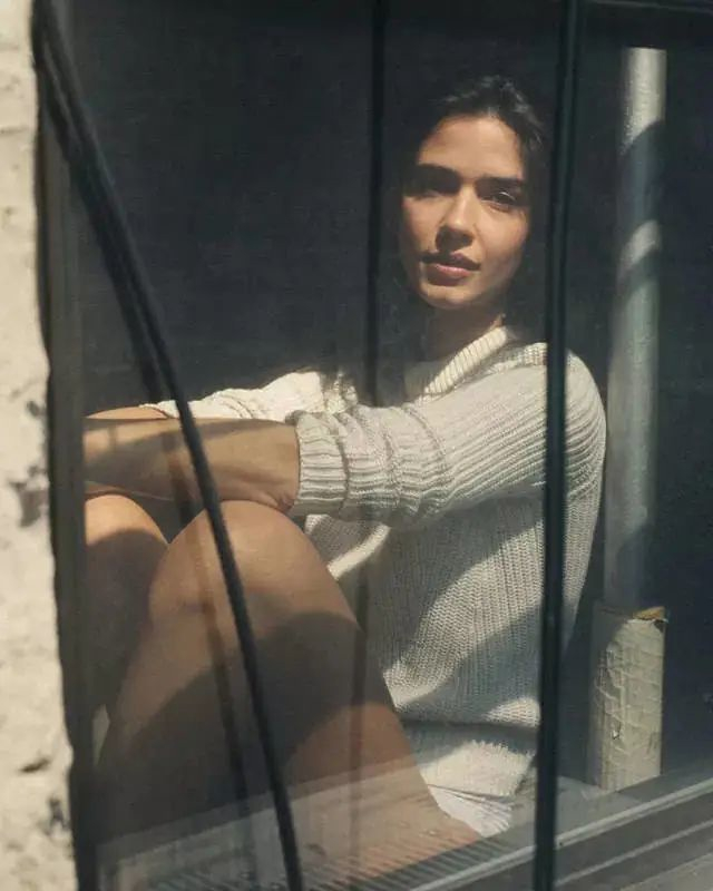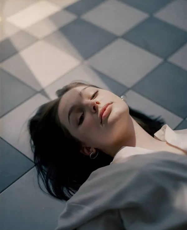 在拍摄这种低角度人像时,可以让模特姿势伸展一些,选择偏侧面的角度,在画面中构建对角线构图,这样不仅可以让人物比例显得舒适,还可以让画面观感更佳。