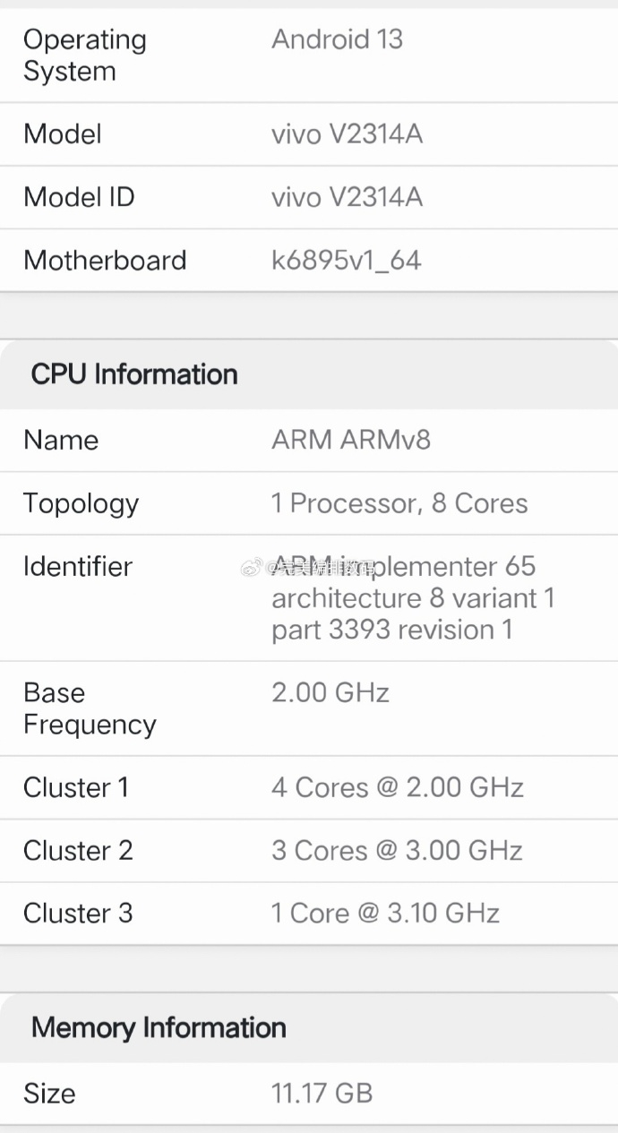 跑分信息显示,iQOO Z8 手机配备 1 颗 3.10GHz 核心、3 颗 3.00GHz 核心以及 4 颗 2.0GHz 核心,CPU 参数与天玑 8200 处理器相符。此外,跑分机型还配备 12GB 大内存,预装 Android 13 系统。