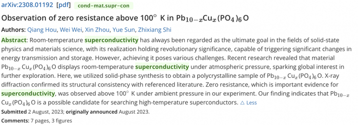 目前,东南大学物理学院超导研究团队的相关论文已经在arXiv上发表(如下图所示),论文摘要中也写道,零电阻是超导电性的重要证据,实验表明Pb₁₀-ₓCuₓ(PO₄)₆O 可能是高温超导体的候选者。