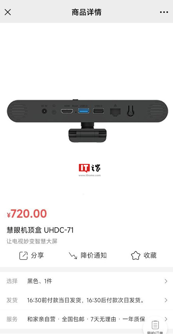 IT之家在中国移动官方商城发现,有一款型号为 UHDC-71 的慧眼机顶盒已经上架,外观与上述产品有所差异,配置描述基本一致,售价 720 元。
