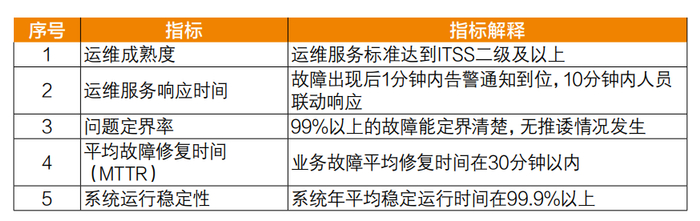 运维的基本目的是保障业务系统的平稳与安全运行,核心办法是减少、避免运维过程中潜在的人员、管理、技术等各类风险。集成运维模式通过制定规范的流程制度,提供更标准化、更稳定、更可靠的运维服务,降低业务中断序号指标指标解释1运维成熟度运维服务标准达到ITSS二级及以上2运维服务响应时间故障出现后1分钟内告警通知到位,10分钟内人员联动响应3问题定界率99%以上的故障能定界清楚,无推诿情况发生4平均故障修复时间(MTTR)业务故障平均修复时间在30分钟以内5系统运行稳定性系统年平均稳定运行时间在99.9%以上表1集成运维模式效果评估可参照的5个关键指标风险。依托运维管理平台,工作人员能够及时发现系统风险,在问题发生之前将其解决。