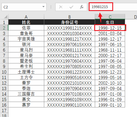 等等,讲到这里,也许就有同学想问,既然【Ctrl+E】可以直接提取身份证中的生日,为什么不干脆把第一个单元格中的日期设为「1998/12/15」,然后直接填充呢?