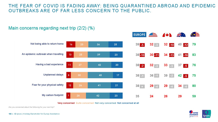一些指标显示,与COVID-19有关的担忧及其对旅行习惯的影响正在随着时间的推移而消失:越来越少有游客在旅行时避免拥挤的地方,并且在旅行时担心疫情爆发或在国外被隔离的人数也在减少。