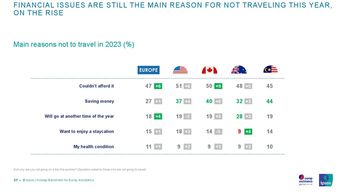 在可能抑制明年夏季旅游热情的原因中,通货膨胀显然是首要因素。几乎1/3的欧洲人表示,价格上涨严重影响了他们的热情。美国人、加拿大人、澳大利亚人和马来西亚人这么认为的比例在31%-42%之间。