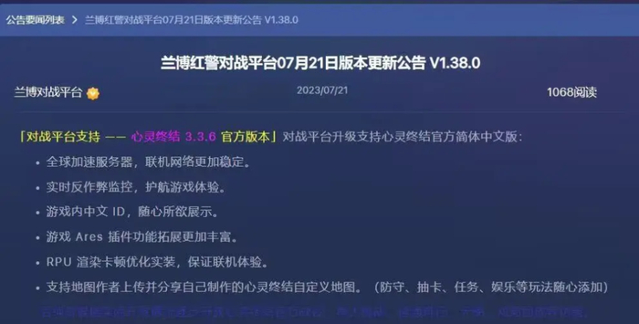 正所谓“网络游戏不会使人暴力,网络延迟才会”,在多人对战这块,国内的对战平台架设的服务器显然要比海外出身的《心灵终结》靠谱得多。7月21日,红警圈知名联机对战平台“兰博玩对战平台”站了出来,宣布将《心灵终结》MOD集成至自家平台,玩家无需自行搭建服务器,也不必再担心频繁的掉线卡顿,只需在平台内点击下载,即可直接畅玩。
