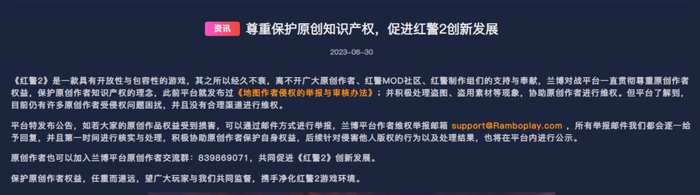 为此,6月30日,兰博玩特意发表了一篇名为“尊重保护原创知识产权”的公告,剑指红警圈内盗图、盗用素材等恶劣行为,并表示愿意协助原创作者进行维权,共同促进红警创新发展。只不过,不到一个月后,这则公告好像就失去了它的效力。