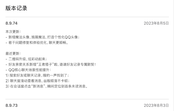 截至发稿,iOS 版 QQ 最新版依然是 8 月 5 日发布的 8.9.74 版本,更新公告如下: