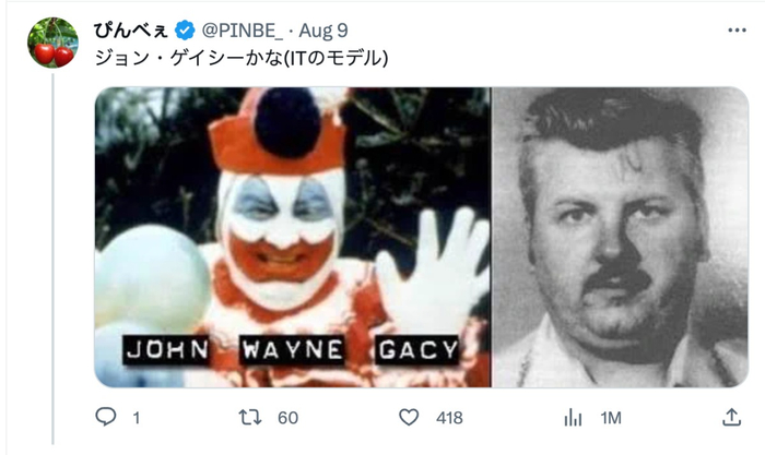 甚至有人将其列比为《小丑回魂》的原型约翰·韦恩·盖西,一位装扮成小丑的连环杀人狂。