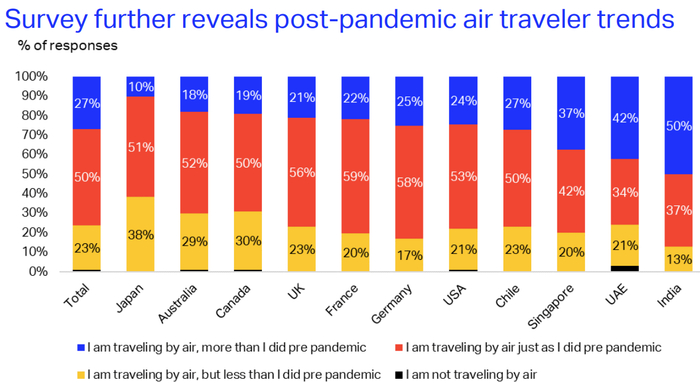 13%的印度和38%的日本航空旅客表示,他们目前的旅行次数比2020年前减少了。对大多数国家来说,这一比例在20%至30%之间,尽管比一年前的平均水平(37%)有所下降。来自加拿大和澳大利亚的乘客中有较高比例的人表示,他们乘坐飞机的次数比以前少了。