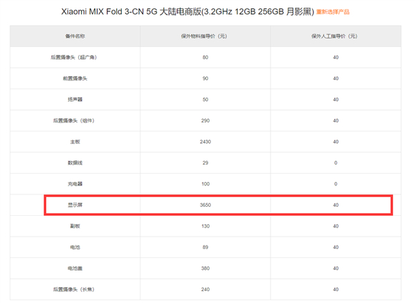 以小米MIX Fold 3 12GB+256GB月影黑版为例,最贵的配件为显示屏,保外指导价高达3650元,人工费为40元,这个价格已经够买一台顶配版Redmi K60至尊版了(24GB+1TB为3599元)。