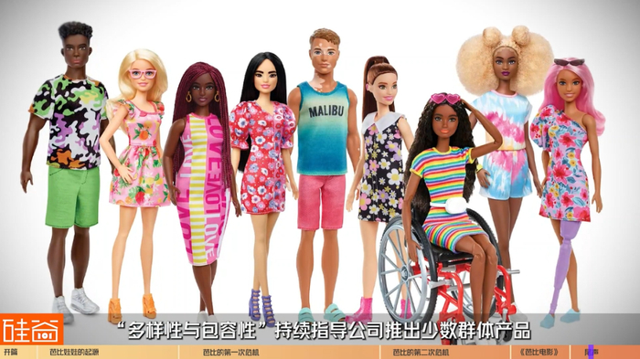 美泰在努力的尝试,甚至在我们看到,是360度各方位的尝试:2022年年初,美泰赢回与迪士尼的合作,灰姑娘、艾莎公主等回归到芭比娃娃的行列。“多样性与包容性”持续指导公司推出少数群体产品,包括2022年推出佩戴耳后助听器以及假肢的芭比,2023年推出第一个唐氏综合征芭比等等。