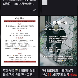 红星新闻记者在调查中发现,提供“陪拍”服务的群体中,大多是年轻人(00后、95后),分为专职和兼职。价格由拍摄设备、场景、出行线路、参与人数、拍摄难度等决定,平均价位在20元-128元/小时 。他们在个人社交账号上发布陪拍信息“接单”,陪拍地点多为城市地标景点(比如宽窄巷子等)以及成都周边游等地。其中,有从业者提供“规划游览线路”“妆造造型指导”等服务。