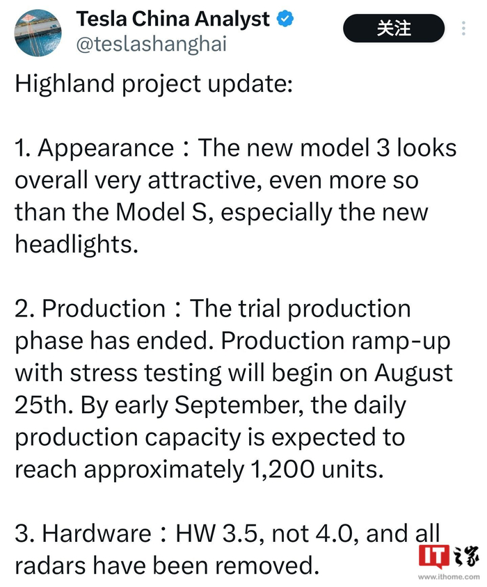 据 @teslashanghai 的最新消息,特斯拉新款 Model 3 已经结束“试生产阶段”,生产提升和压力测试将于 8 月 25 日开始。到 9 月初,预计日产能将达到 1200 台左右。该博主称,“新款 Model 3 的外观非常吸引人,甚至比 Model S 还要漂亮,尤其是新款的大灯”。