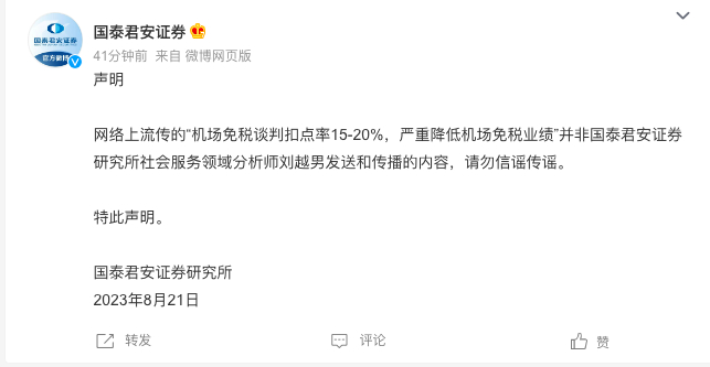 21日盘后,国泰君安也发布声明称,网络上流传的“机场免税谈判扣点率15%-20%,严重降低机场免税业绩”并非国泰君安研究所社会服务领域分析师刘越男发送和传播的内容,请勿信谣传谣。