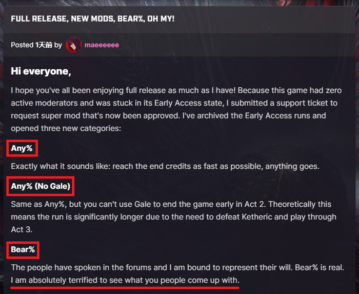 作为速通先驱之一,Mae成功申请到了Speedrun速通网站《博德之门3》专区的超管权限。他设计了三个速通项目,分别是“Any%”、“Any%(No Gale)”和“Bear%”。