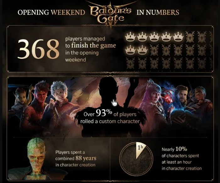 根据8月11日拉瑞安工作室公布的首周游戏数据,仅有368名玩家在3天72小时内成功通关了《博德之门3》。
