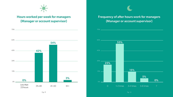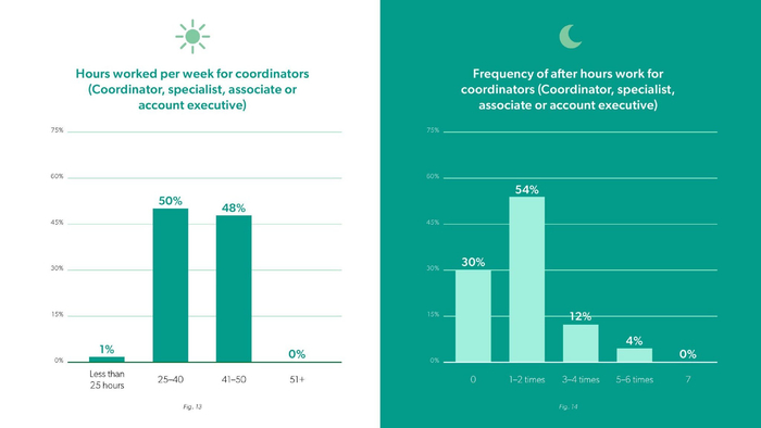 57%的公关人员表示每周工作超过40小时,近80%的人每周至少有一次加班。
