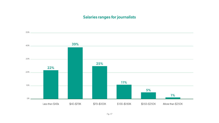此外,数据显示,高薪工作明显缺乏,尤其是与公关相比。收入在10万美元或以下的记者比例更高,达到84%,而公关专业人士的这一比例为65%。