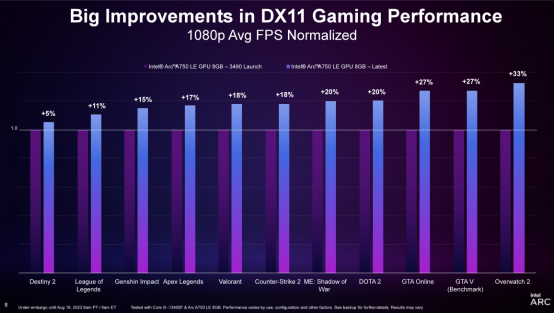 通过最新 Game On 驱动的发布,英特尔锐炫显卡在运行一系列 DX11 游戏的时候,能够获得 19% 的帧率提升,以及平均约 20% 的99th Percentile帧率流畅度提升(相较于首个驱动版本)。此前购买使用过英特尔锐炫 A750 显卡的用户,可以直接下载最新驱动,在《守望先锋 2》、《DOTA 2》、《Apex Legends》等游戏中获得体验升级。