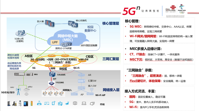 校园超融合网络采用部署下沉式5G MEC作为网络“中枢大脑”,以此实现CT与IT的一体化融合,不仅可以保障校园网络的数据安全、可靠接入,同时完成5G、Wi-Fi及千兆光网的统一接入管 理,实现三网统管。