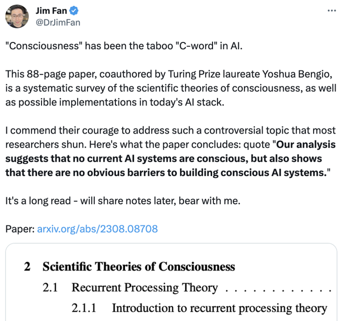 “ ‘意识’一直都是AI领域大家讳莫如深的话题。这篇由图灵奖得主Yoshua Bengio参与撰写的88页论文,是对意识科学理论以及当今人工智能堆栈中可能实现的系统调查,我赞扬他们有勇气去解决这个大多数研究人员都会回避的争议性话题。”