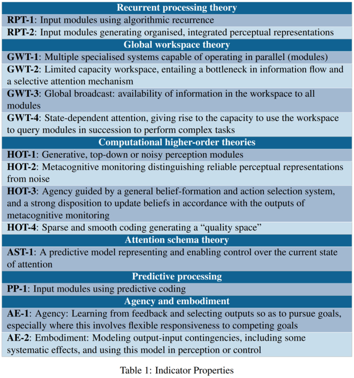 基础原则确定之后,接下来就进入到了更细致的“打分”环节。因为此前,学界对意识的研究已经有了一些公认的结果,比如科学家和哲学家对意识必要条件的主张等等,论文作者在研究中做的事情就是,从过往对意识研究的成果中选取一部分科学理论,作为判断AI是否具有意识的更具体的评估依据和指标