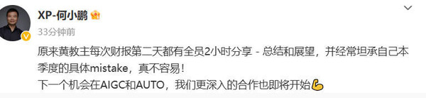 【CNMO新闻】8月24日,CNMO注意到,小鹏汽车董事长何小鹏晒出了自己和英伟达掌门人黄仁勋,以及前小鹏自动驾驶副总裁吴新宙的合影。何小鹏表示:原来黄教主每次财报第二天都有全员2小时分享 - 总结和展望,并经常坦承自己本季度的具体mistake,真不容易!他同时透露称:“下一个机会在AIGC和AUTO,我们(小鹏汽车和英伟达)更深入的合作也即将开始。”