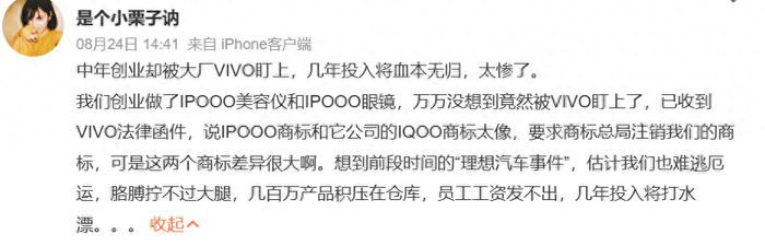 一则疑似吕耀刚本人账号的微博表示,其中年创业却被大厂vivo顶上,非常担心因为此次对方提出异议,最终的结果是胳膊拧不过大腿,数年投入将打水漂,甚至因仓库存积压,连员工工资都发不出。