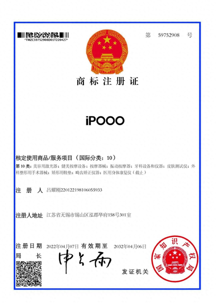 在决心创业前,吕耀刚已经筹备数年,先后找设计、找工厂、注册商标,寻找投资人和合伙人等,同时于2021年10月注册了IPOOO第3类、第9类、第10类商标,并于次年4月7日获得了IPOOO注册商标注册权与注册商标证书。2023年1月1日,吕耀刚也签署了IPOOO品牌授权书,授权其合伙创办的俏电(上海)科技有限公司(法人:汪熹)在全渠道使用IPOOO商标,授权有效期为10年。