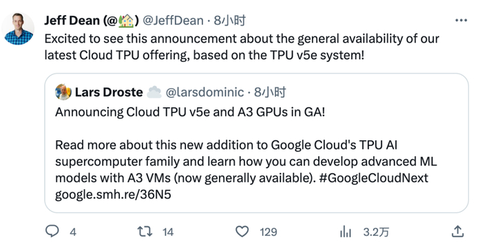 谷歌首席科学家、知名学者 Jeff Dean 的推文。