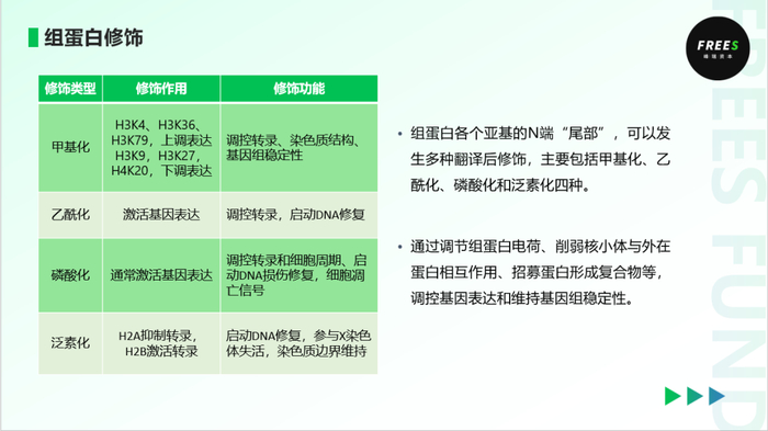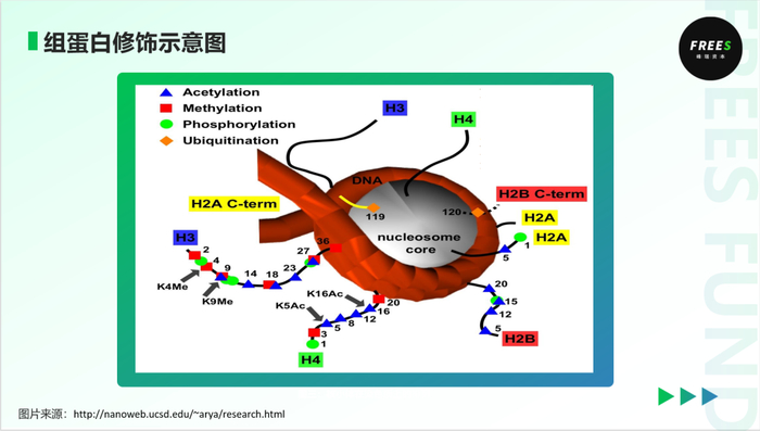 组蛋白和DNA之间可被理解为依靠静电吸附连接在一起。组蛋白修饰通过调节组蛋白电荷、削弱核小体与外在蛋白相互作用、招募蛋白形成复合物等方式,在其尾部发生修饰,影响染色体的三维结构,调控基因表达。