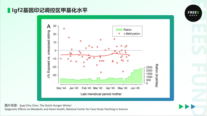2008年,学者研究对比了大饥荒阶段生育的子女,与他们兄弟姐妹的Igf2调控区甲基化水平。结果显示,大饥荒阶段生育的子女的甲基化水平,显著低于未经历大饥荒的兄弟姐妹。