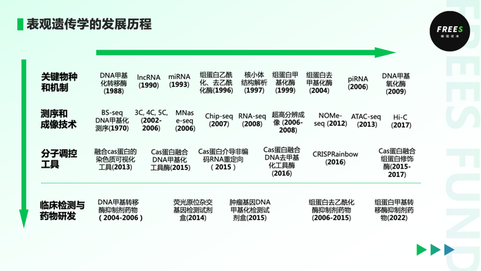 1942年,生物学家Waddington提出“表观遗传学”的概念。之后,表观遗传学在关键物种和机制、测序和成像技术、分子调控工具、临床检测与药物研发应用等细分方向不断取得进展,经历了从观测、测量,到操控与制造的发展过程。