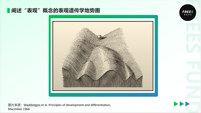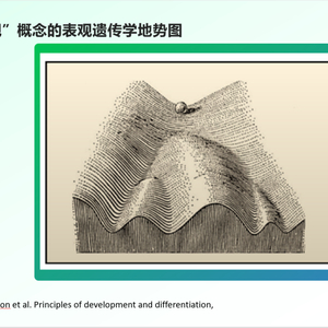 表观遗传地势图形象地解释了“表观”的概念。图中把基因的表达类比为一个铁球从山坡滚下的过程,不同的调控因素对应不同的山坡,这些山坡的走势影响了小球落到哪个山谷,也就是如何表达。