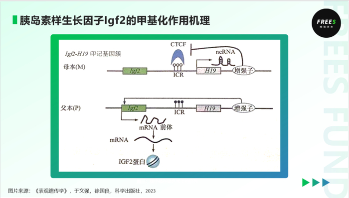 Igf2是一个父系表达的印记基因。如下图所示,在正常的人体生理状况下,母本Igf2的印记基因调控区(ICR)没有被甲基化,调控蛋白(CTCF)能够结合ICR区域,从而阻挡下游增强子接近Igf2基因,Igf2基因无法表达。相反,父本的调控区被甲基化,甲基的空间阻碍使得调控蛋白无法结合ICR区域。因而,下游增强子可以接近Igf2基因,并启动促进生长发育必要的生长因子的表达。简单来说,Igf2的父本印记基因表达,而母本印记基因不表达。