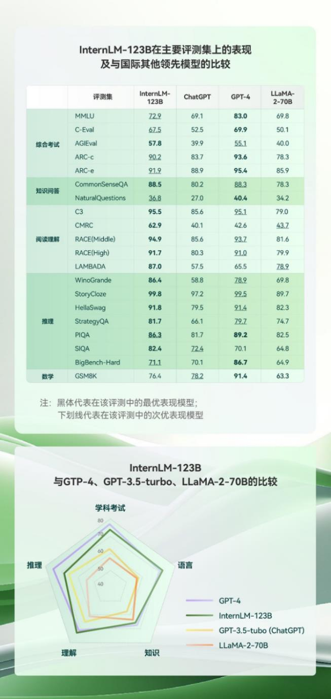 商汤“商量SenseChat”今年4月正式推出,是国内最早的基于千亿参数大语言模型之一,并不断迭代更新。目前,基模型为商汤联合多家国内顶级科研机构发布的书生·浦语InternLM-123B,拥有1230亿参数,在语言、知识、理解、推理和学科五大能力上均处于行业领先水平,并在全球51个知名评测集(包括MMLU, AGIEVAL, ARC, CEval, Race, GSM8K等)共计30万道问题集合上测试成绩整体排名全球第二,在主要评测中12项成绩中排名第一!