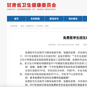 甘肃省卫健委官网上关于免费医学生招生政策的介绍。此外,几位不愿具名的兰州大学定向免费医学生还提到,基层卫生院的工资和工作内容也是他们要违约考研的原因。