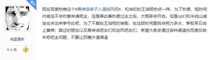 当然,也有原住民认为这次风波是一个好机会。因为借着这次风波,有大量无关的网友进入了剑风吧,原住民发帖请他们帮忙向百度贴吧官方投诉和举报,让贴吧管理团队重视剑风吧的情况,进而借机打开吧主申请渠道。