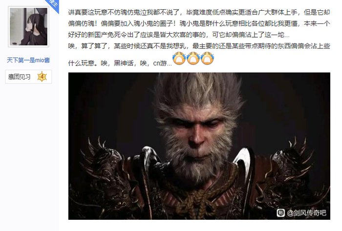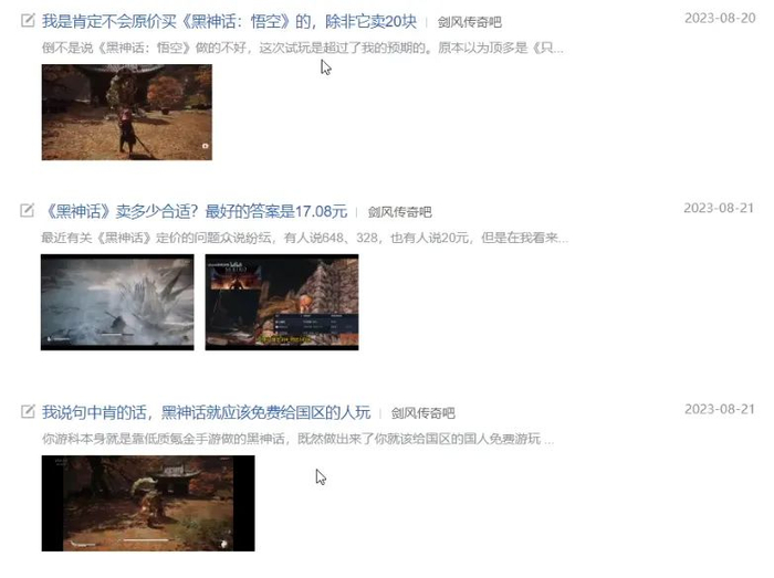 自从游戏科学举办《黑神话》杭州线下试玩之后,百度剑风传奇吧就热闹了起来。短短几天内,吧内已经充斥了大量“捧黑”帖、 “踩黑”帖、有意为之的引战帖。