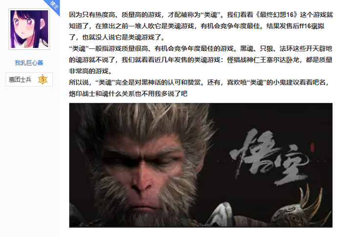 如今宫崎英高作品的热度越来越高,模仿者日益增多,类魂的概念也在逐渐泛化。互联网上人人在说“魂”,但很难说得清究竟什么是“魂”,以致于每当有人提起这一话题,总少不了一番争执。因此,“《黑神话》够不够魂”就成了最好的引战话题。