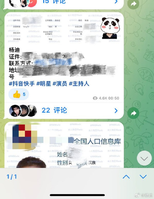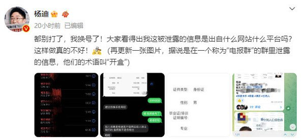 在互联网时代,个人身份信息泄露已成为严重的隐患。近日,艺人杨迪在社交平台上发文,称自己的个人信息被泄露,频繁受到骚扰电话的困扰,甚至不得不更换手机号码。他同时晒出了截图,显示自己的身份证信息等个人私密信息被公开,表示被“开盒”了,引发了公众的广泛关注。