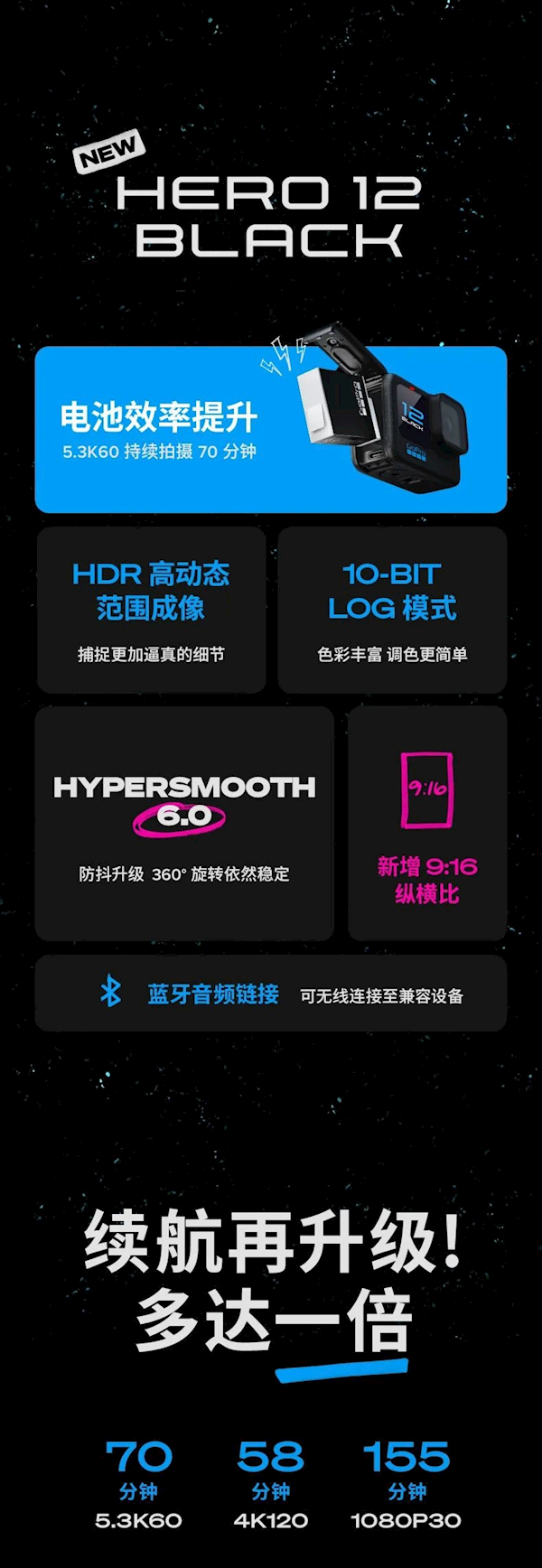 该运动相机一大升级是支持超长录制功能,得益于重新设计的电源管理系统,使用Enduro电池时,相比上一代Hero 11 Black,续航时间可以提高两倍,可录制70分钟5.3K/60FPS视频、155分钟1080P/30FPS视频。