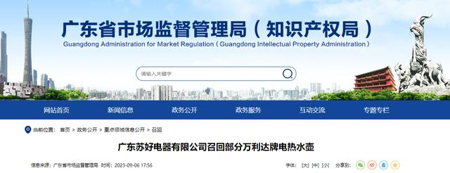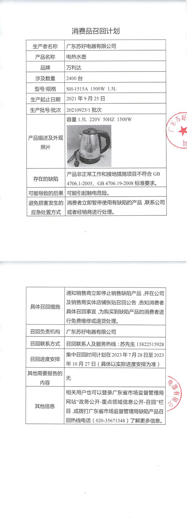 据广东省市场监督管理局网站2023年9月6日消息,日前,广东苏好电器有限公司按照《消费品召回管理暂行规定》的要求,主动向广东省市场监督管理局报告了召回计划,将自即日起,召回2021年9月25日制造的部分万利达牌SH-1515A型号电热水壶,涉及数量为2400台。