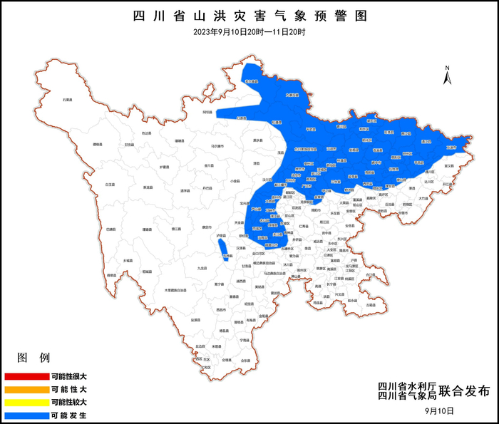 9月10日,四川省水利厅、四川省气象局联合发布山洪灾害蓝色预警。这是9月8日以来,四川省连续发布的第三个山洪灾害蓝色预警,且预警范围持续扩大。