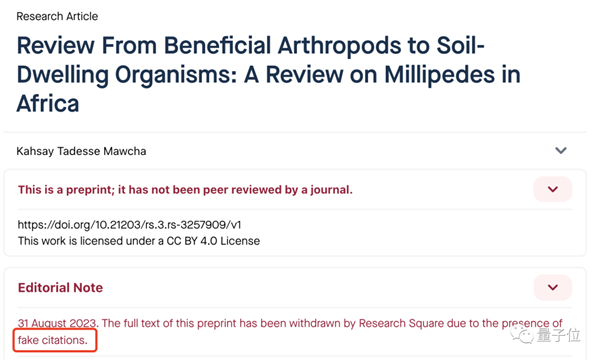 Retraction Watch就曾爆出一篇由AI撰写的千足虫预印本,因为含有虚假引用而被撤回,随后又被重新上线。