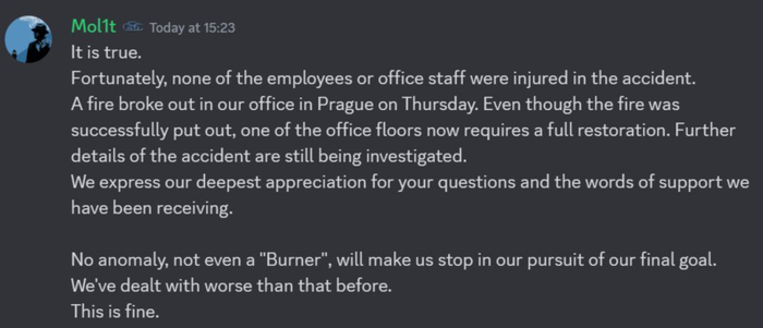 面对玩家们的关心,制作组的一位成员表示:“事故的进一步细节仍在调查中,对于大家的询问和支持我们深表感激。就算是‘失火’,也无法阻挠我们追求最终目标的脚步。我们曾面对过比这更糟糕的情况,所以没事的。”