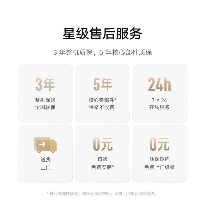 作为净热一体机,机箱深度是安装的关键。为此,米家即热净水器Q1000不仅机身小巧,做到了规整不占地、好收纳、好打理,还提供产品送货上门、首次免费上门安装,后续更有1年整机质保、3年核心部件质保、7✖24小时服务热线随时待命,安全感满级。