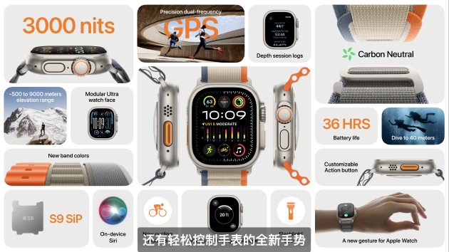 Apple Watch 9支持50米防水和游泳使用,正常使用和低电量模式续航依然是18小时和36小时;Ultra 2支持100米防水和40米深潜水,正常使用和低电量模式续航依然是36小时和72小时,足以完成铁人三项运动。Series 9和Ultra 2的起售价格分别为人民币2999和6499元,在9月14日上午9时接受预定,9月22日上市发售。