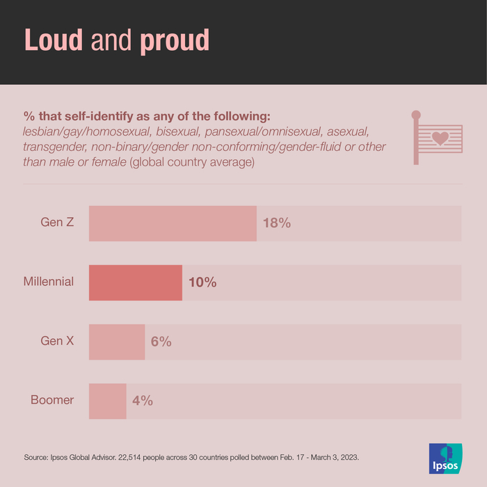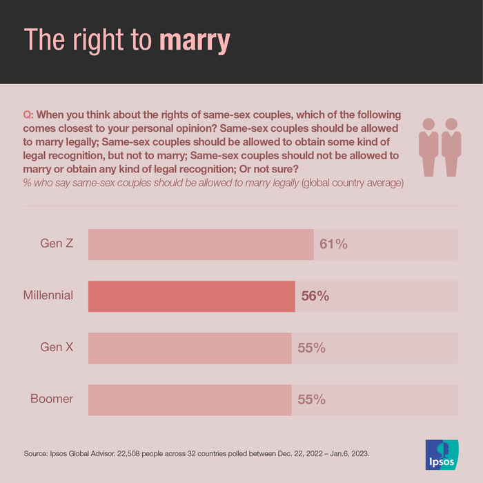益普索最近的“骄傲月”民意调查发现,在32个国家中,平均56%的千禧一代同意同性伴侣应该被允许合法结婚,与X世代(55%)和婴儿潮一代(55%)一致,但略低于Z世代(61%)。